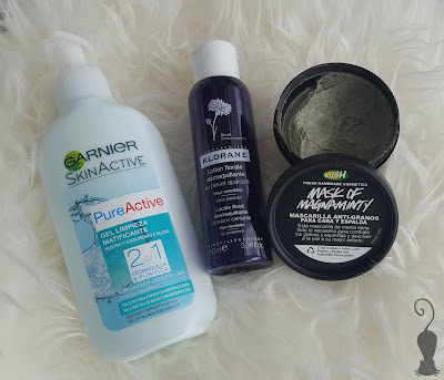 Para la limpieza facial, utilizo el desmaquillante de ojos de Klorane, y para el rostro el gel de limpieza Pure Active de Garnier, ambos me están funcionando muy bien. El desmaquillante de ojos me gusta porque no me escuece nada al desmaquillarlos y elimina genial todo tipo de máscaras de pestañas y eyeliners, sean o no resistentes al agua. El gel de limpieza también genial, no me irrita nada la piel, tengo la piel mixta y no me la deja tirante, ni me aporta grasa ni nada, perfecto. Una vez a la semana me gusta aplicarme la mascarilla Mask of magnaminty de Lush, es una mascarilla anti granos para cara y espalda. A mi me deja la piel increíble de limpia, huele mucho a menta y escuece un poco al aplicarla pero nada que no se aguante, se va secando y después de 10-15 minutos yo la retiro con agua tibia y me deja la piel genial, poros cerrados y aspecto de buena cara.
